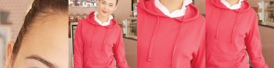 - Three-piece jersey lined, contrast-color hood with sewn eyelets and contrast-color drawcord