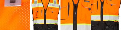- Outside lower front pockets with flaps, left and right stake pockets, left and right elastic spray paint can pockets