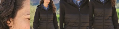 - Contrast melange fleece on hood, shoulders, and sleeves