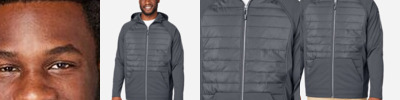 Body: 6 oz./yd²/200 gsm (US), 10 oz./ L yd (CA), 3-Layer 100% polyester interlock bonded to polyester birdseye with inner membrane Contrast: 1 oz. polyester shell with polyester Lining in front & back hybrid panels Insulation: 2.3 oz. poly fill in front & back hybrid panels 8,000 mm waterproof rating 1,000 g breathability rating Center front reverse coil zipper, with rubber toggle Zippered pockets at lower front, and left sleeve Reflective piping details Tear away main label
