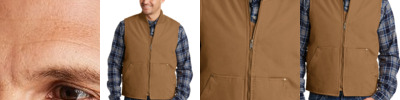 Rugged and ready to take on the toughest jobs, this warm, soft, layerable vest is enzyme-washed for a lived-in look and easy fit. The length allows tool-belt access, but is also ideal for everyday use. 12-ounce, 100% cotton enzyme-washed duck cloth 100% polyester taffeta lining quilted to 6-ounce, polyfill insulation Rib knit collar Metal rivets at crucial stress points Front hand warmer pockets Interior pocket with hook and loop closure Decoration access pocket
