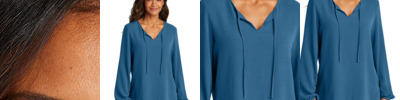 A fresh neckline with tie gives this comfortably flowy blouse a sophisticated look. 4.5-ounce, 100% polyester textured crepe Open neck with self-fabric tie Elastic cuffs Side slits