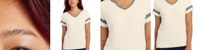 Show off your team spirit with this fashion-inspired tee. 4.5-ounce, 60/40 combed ring spun cotton/polyester V-neck Self neck tape Tear-away label Crossover at center neck trim Raglan sleeves Colorblock detail at neck and sleeve stripes Curved hem with slight drop at back