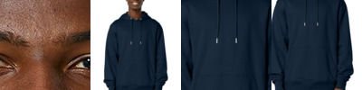 A premium hoodie with a classic look. Organic and recycled fabrics blend beautifully, offering cozy warmth with refined details that stand out from the crowd. 10.3-ounce (350 GSM) 80% organic combed ring spun cotton/20% recycled polyester brushed 3-end fleece, cotton face Double self-fabric lined hood Dyed-to-match round drawcords with metal tips Metal eyelets Herringbone back neck taping Self-fabric half moon at back neck 1x1 rib knit cuffs and hem Double-needle topstitch on armholes, cuffs and hem seams Front pouch pocket 100% recycled polyester tear-away label Colors up to 5XL: Black, French Navy, Heather Grey, Natural Raw, Stargazer, White Modern medium fit: Designed for a roomier fit, opened up across the chest and shoulders.