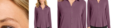 A versatile complement to any wardrobe, this polished tunic offers supreme comfort and a touch of luxury. 6.6-ounce, 94/6 rayon/spandex jersey Open self-fabric collar with collar stand Decorative, non-functioning 6-button placket with faux horn buttons Long dolman sleeves Front and back seam details Self-turned cuffs and hem Tunic length, drop tail hem