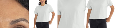 4.45-ounce, 100% US cotton 90/10 cotton/polyester (Sport Grey) Non-dyed fabric with visible specks of fibers and cotton seeds (Natural) Narrow width, rib collar Taped neck and shoulders Modern classic fit, seamless body Recycled, high-performing black tear-away label