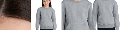 The youth version of this popular cozy crew with a hoodie-style front pocket. 7.8-ounce, 50/50 cotton/polyester fleece Air jet yarn for softness Front pouch pocket Tear-away label Please note: This product is transitioning from white to black tear-away labels. Your order may contain a combination of both colored labels.