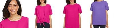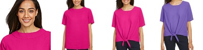 4.5 oz., 155 gsm; 100% polyester crepe; Feminine scoop neckline; Tie-front detail at center front hem;