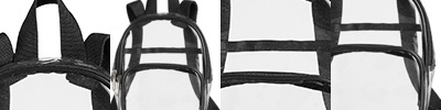 Clear PVC body; Contrasting binding; Zipper closure main compartment; Front zipper pocket: 6.5" x 4.5" x 0.5"; Inside slit pocket; Contrasting adjustable straps; 6.5"W x 8.5"H x 2.75" D; Requires California Prop 65 Warning Label;