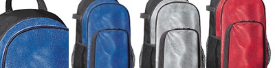 Glitter PU; Front pocket opening is 10'' for easy embellishment; Two-side mesh water bottle/bat pocket; Hidden carabiner for your batting helmet or securing to a fence; Laptop pocket; 12"W x 18.5"H x 7"D;