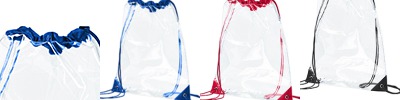 PVC; Clear PVC body; Contrasting binding; Contrasting drawstring straps; 13"W x 16"H ; Requires California Prop 65 Warning Label;